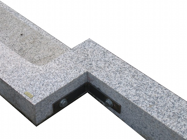延石のコーナー部分に孔をあけ、アンカーを埋め込みます。ボルトとL型金具で結束し、仕上げにコンクリートで巻き込みます。