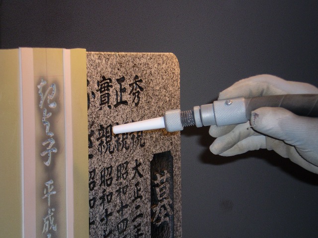 墓石の彫刻文字に墨を入れる場合は、ゴムシートを接着した状態でエナメル塗料を何回か分け高圧エアで吹き付けます。石材と塗料色は、それぞれが映える組み合わせを重視し、濃色系石材には白色、淡色系石材には黒色と反対色を使うことでコントラストを効かせます。